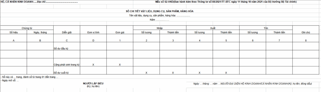 Sổ chi tiết vật liệu, dụng cụ, sản phẩm, hàng hóa (S2-HKD) dùng để quản lý toàn bộ việc nhập – xuất nguyên vật liệu, công cụ, hàng hóa. Giá trị ghi vào là tổng số tiền thực phải chi trả, bao gồm cả thuế GTGT trong trường hợp hộ không được khấu trừ.