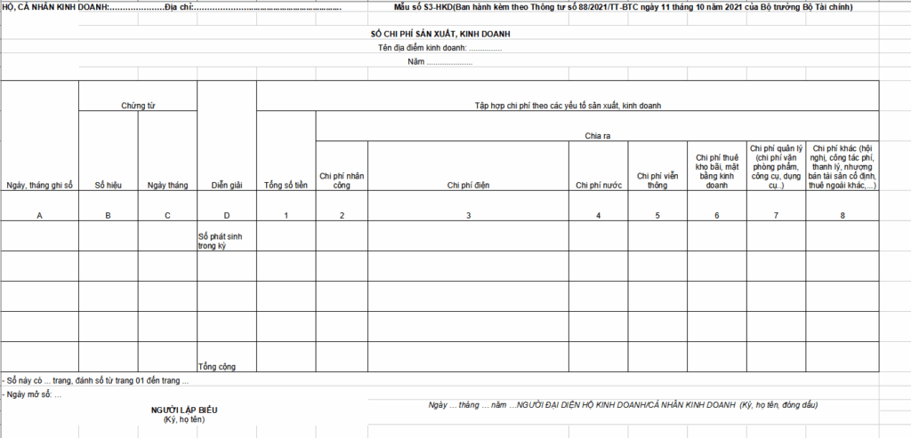 3 Sổ chi phí sản xuất, kinh doanh Mẫu số S3-HKD
