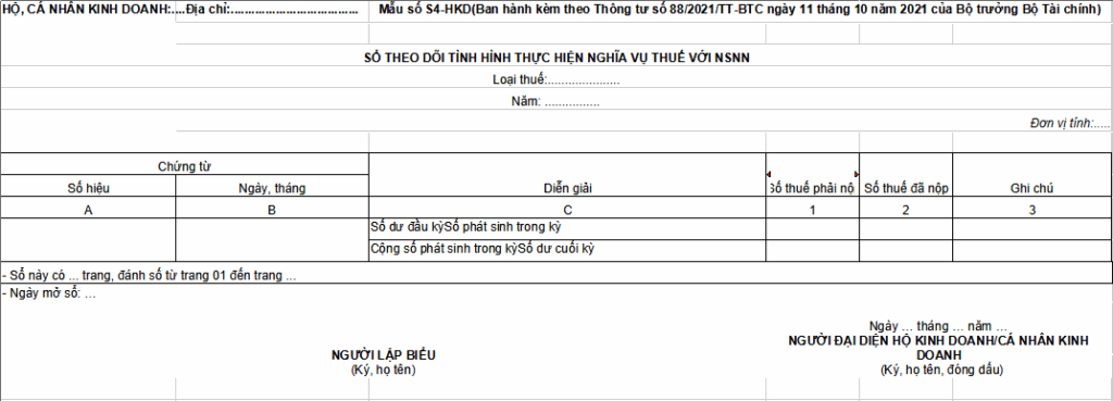 4 Sổ theo dõi tình hình thực hiện nghĩa vụ thuế với NSNN Mẫu số S4-HKD