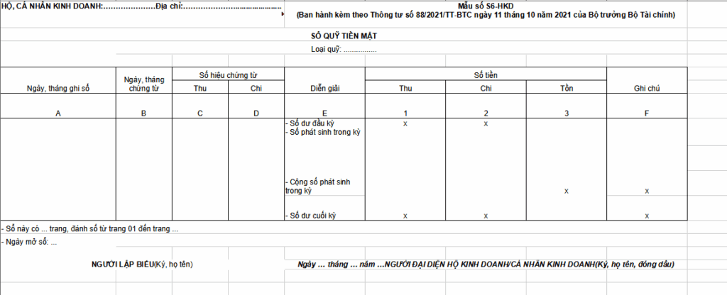 6 Sổ quỹ tiền mặt Mẫu số S6-HKD